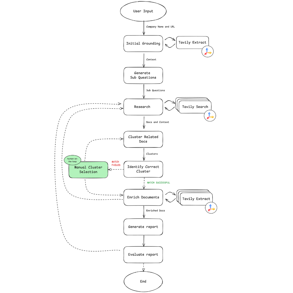 Grounding is core to Tavily’s Company Researcher workflow. It starts with establishing a reliable “ground truth” by using Tavily Extract on a verified company URL. This keeps the system aligned to the correct entity, especially in cases where similarly named companies exist. Creating a foundation to work from minimizes unrelated or erroneous information, improving output accuracy. Feedback loops that refer to the “ground truth” coupled with human-on-the-loop validation further reinforce this foundation, ensuring outputs are consistently relevant and curated for quality.